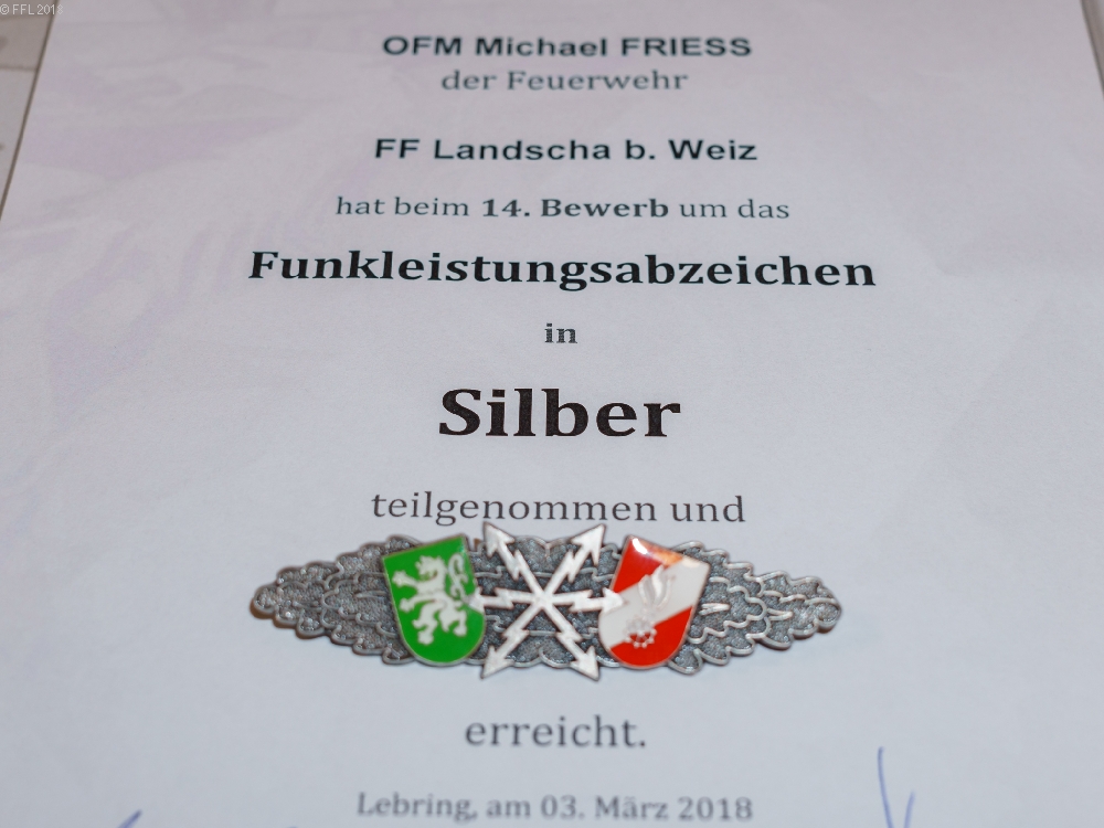 Am 03.03.2018 fand der Bewerb um das FULA Silber und Gold in der Landesfeuerwehr und Zivilschutzschule Steiermark in Lebring statt. Fünf Kameraden der FF Landscha absolvierten diesen erfolgreich in Silber. Herzliche Gratulation an OFM Michael Frieß, OFM Christoph Glaser, OFM Martin Glaser, OFM Patrick Schaffler und OFM Matthias Wiesenhofer zu diesem Erfolg.