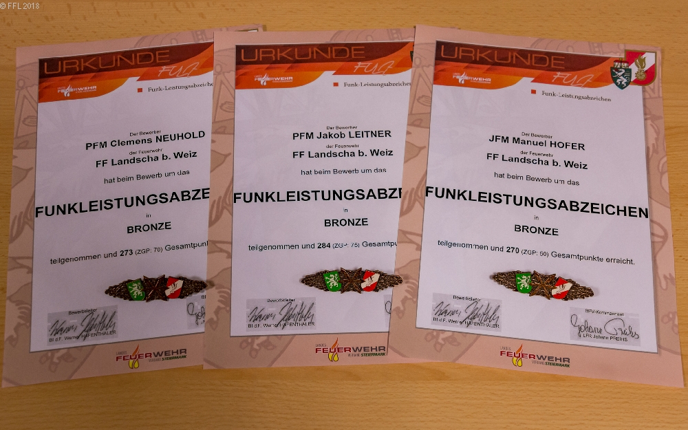 Am 17.11.2018 fand der Bewerb um das FULA Bronze in Gleisdorf statt, an dem drei Kameraden der FF Landscha erfolgreich teilnahmen. Herzliche Gratulation an Clemens Neuhold, Jakob Leitner und Manuel Hofer zu diesem Erfolg und ein herzlicher Dank an Matthias Wiesenhofer und Michael Frieß für die Vorbereitungen zu diesem Bewerb.