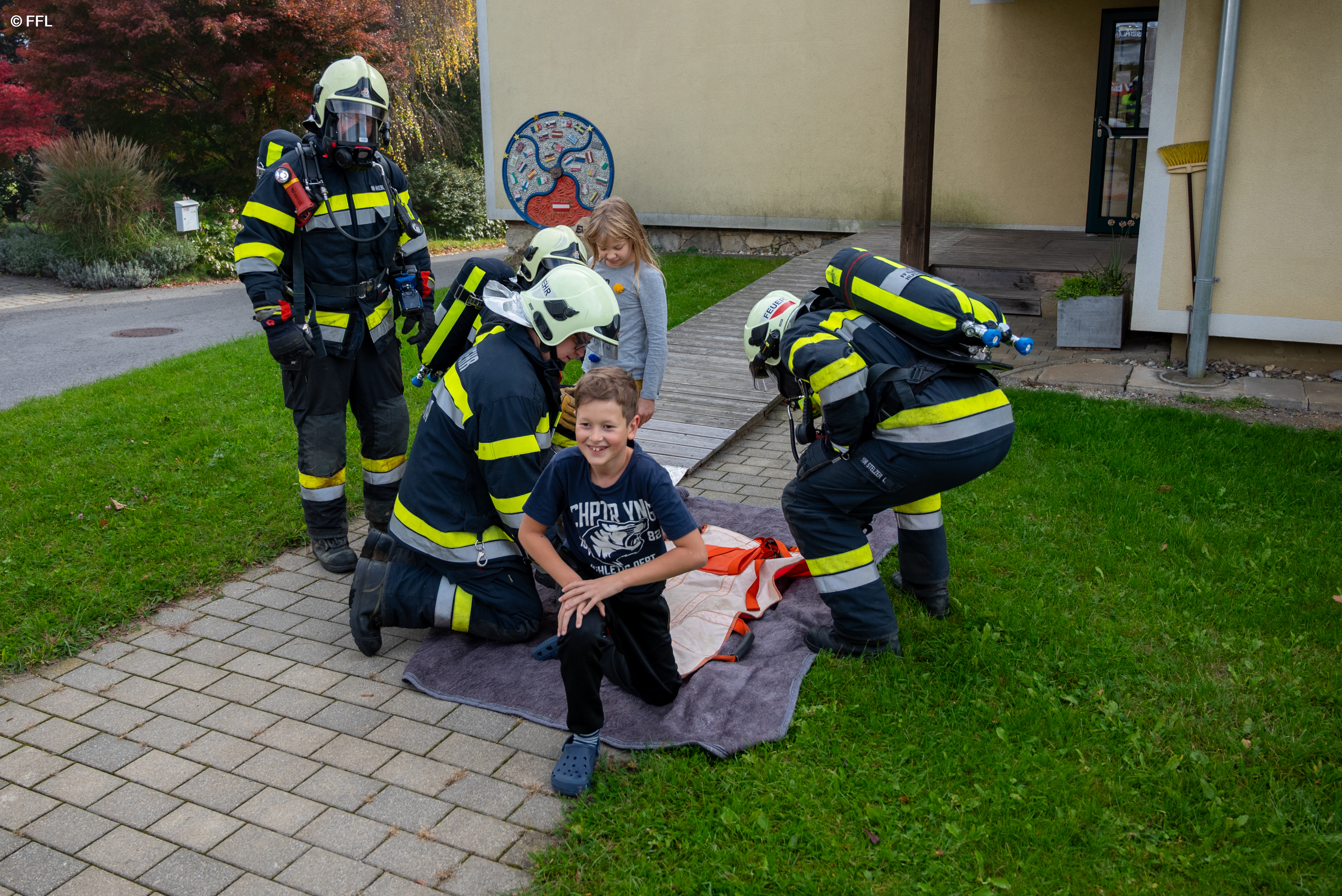 Nach der Lageerkundung am Sammelplatz wurde festgestellt, dass vier Kinder im ersten Obergeschoss vermisst werden. Die vier vermissten Personen wurden vom Atemschutztrupp mithilfe eines Tragetuchs aus dem Gebäude gerettet.