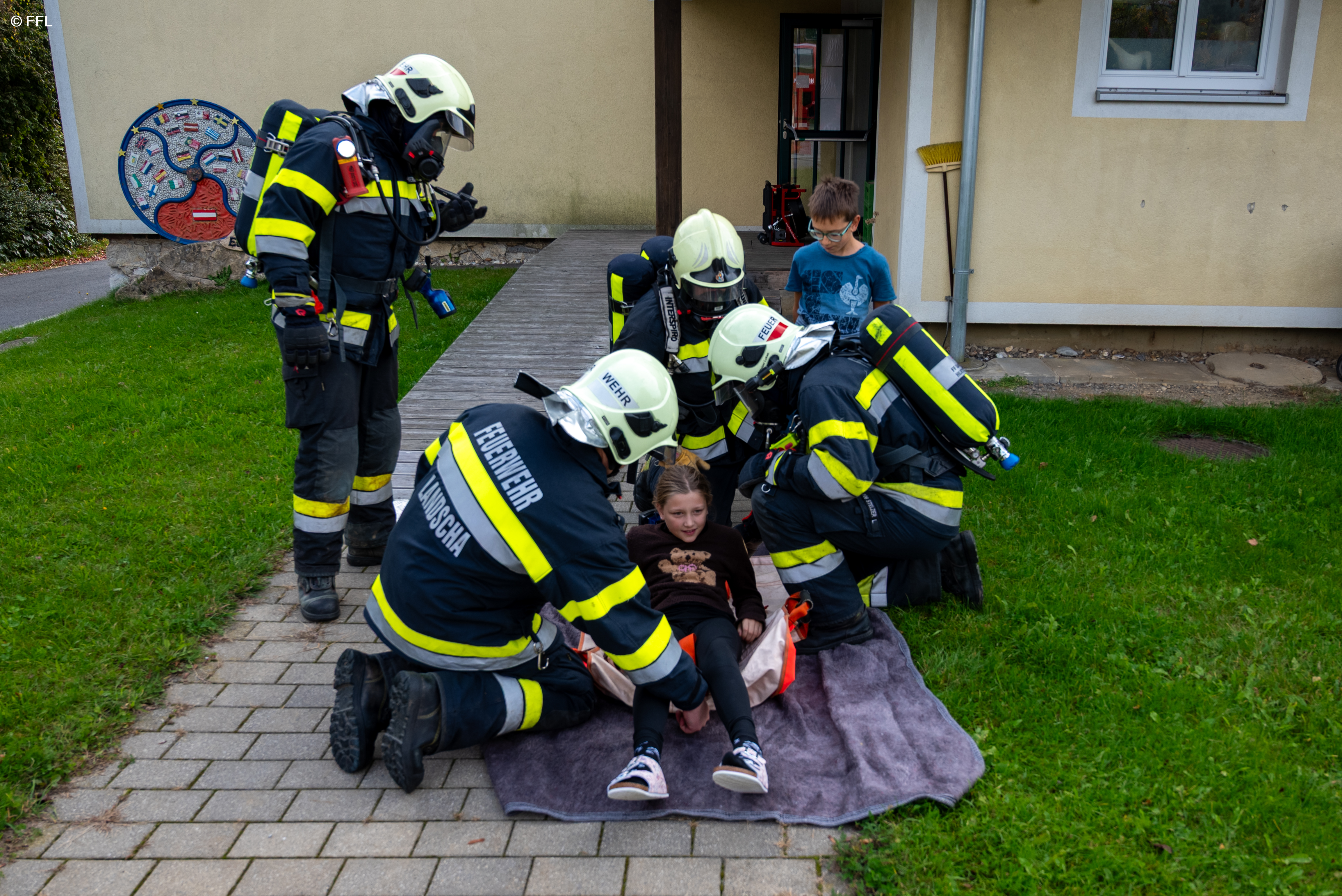 Nach der Lageerkundung am Sammelplatz wurde festgestellt, dass vier Kinder im ersten Obergeschoss vermisst werden. Die vier vermissten Personen wurden vom Atemschutztrupp mithilfe eines Tragetuchs aus dem Gebäude gerettet.