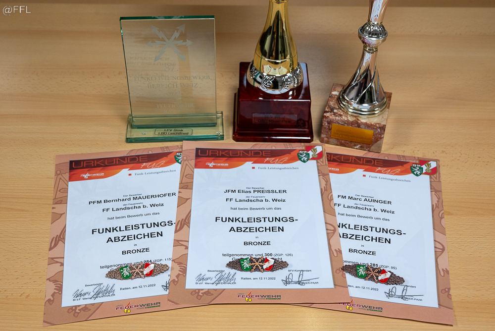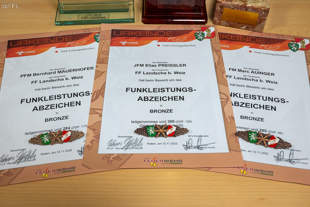Am 12.11.2022 fand der 37. Bewerb um das FULA Bronze in Ratten statt, an dem vier Kameraden der FF Landscha äußerst erfolgreich teilnahmen. Herzliche Gratulation an FM Auinger Marc, PFM Mauerhofer Bernhard und JFM Preißler Elias zum Erwerb des Funkleistungsabzeichens in Bronze sowie LM d.F. Reiser Dominik zur Teilnahme am Pokalbewerb. Besondere Gratulationen ergehen für folgende Leistungen: