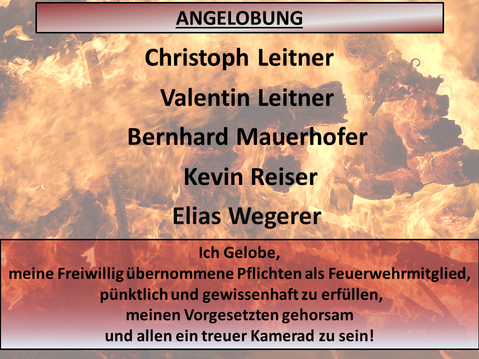 Im Anschluss wurden 5 Kameraden zum FM angelobt, 7 Kameraden befördert und verdiente Kameraden für ihre Leistung ausgezeichnet ( HBM Andreas Zöhrer und HLM Gerhard Zöhrer Verdienstzeichen 2. Stufe, LM Josef Glaser Medaille für 40 Jahre und EHBI Josef Schwaiger Verdienstkreuz in Bronze) . Besonders freute es uns wieder, fünf Jungfeuerwehrmänner als Neuaufnahme in unserer Mitte begrüßen zu können.